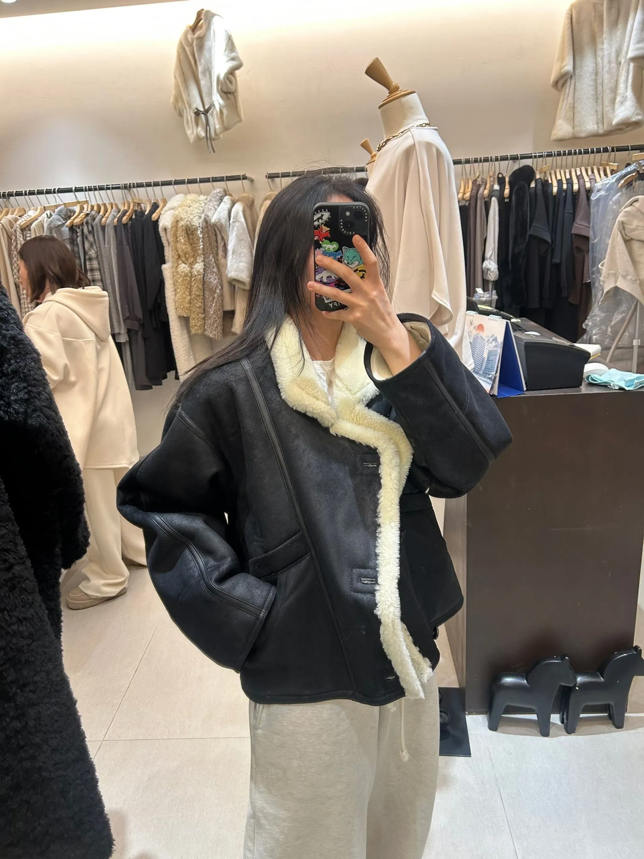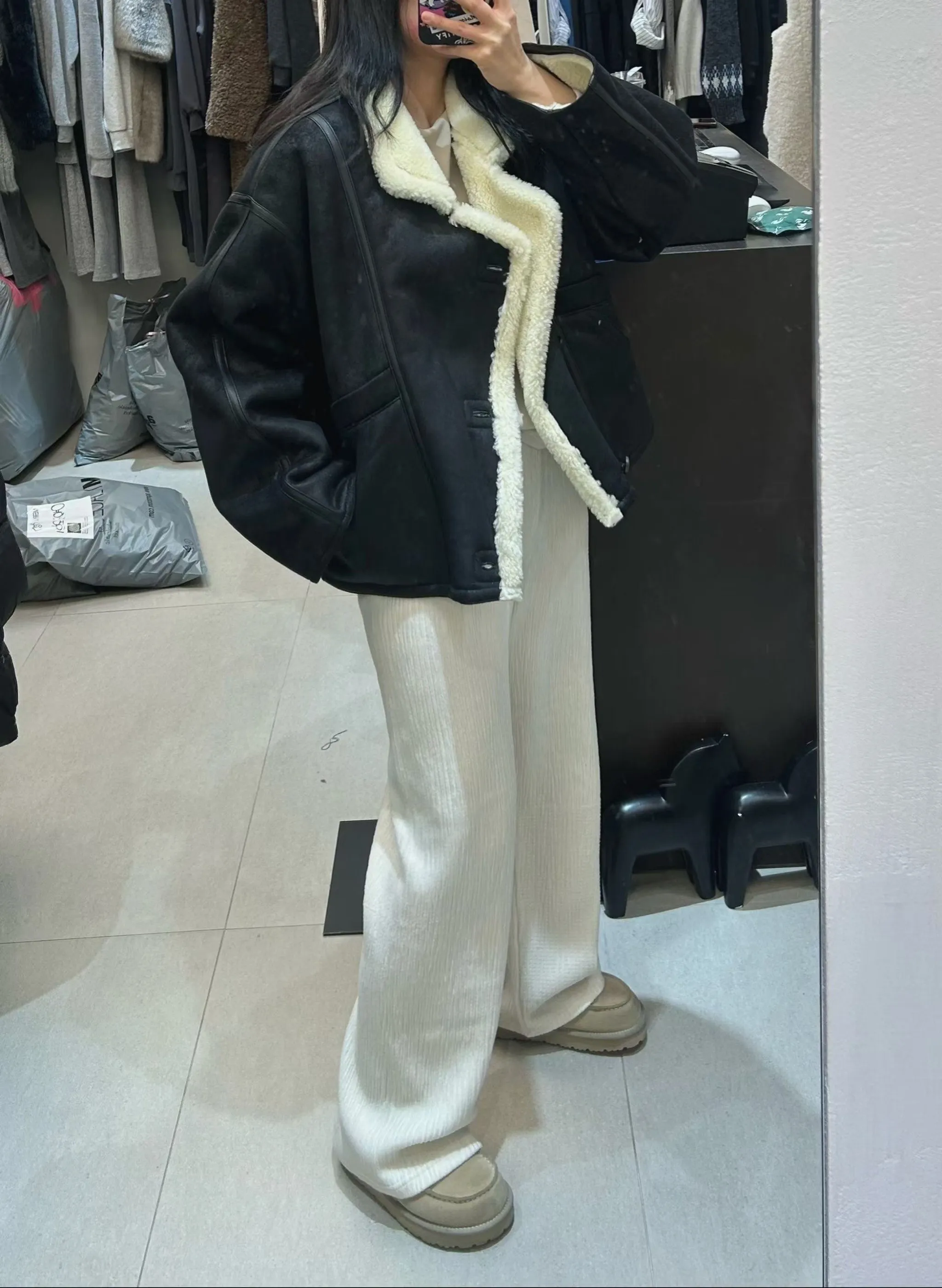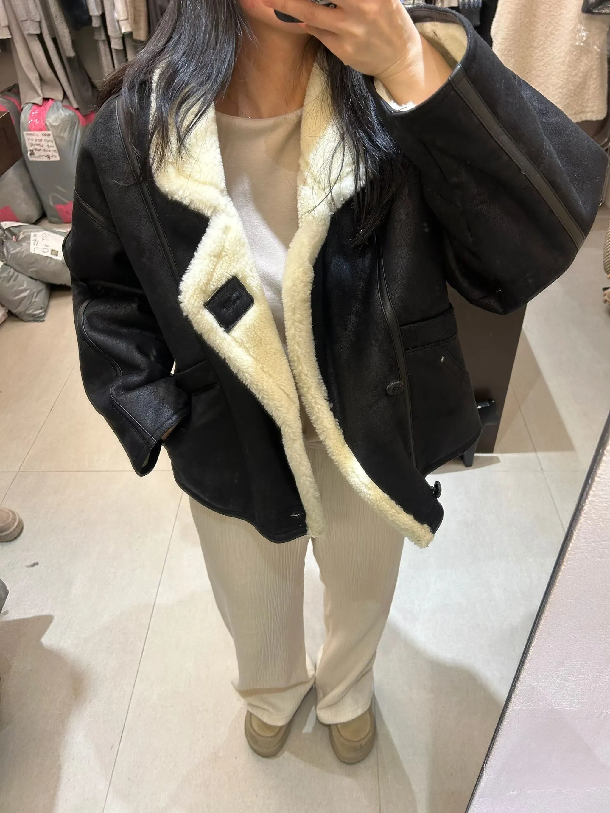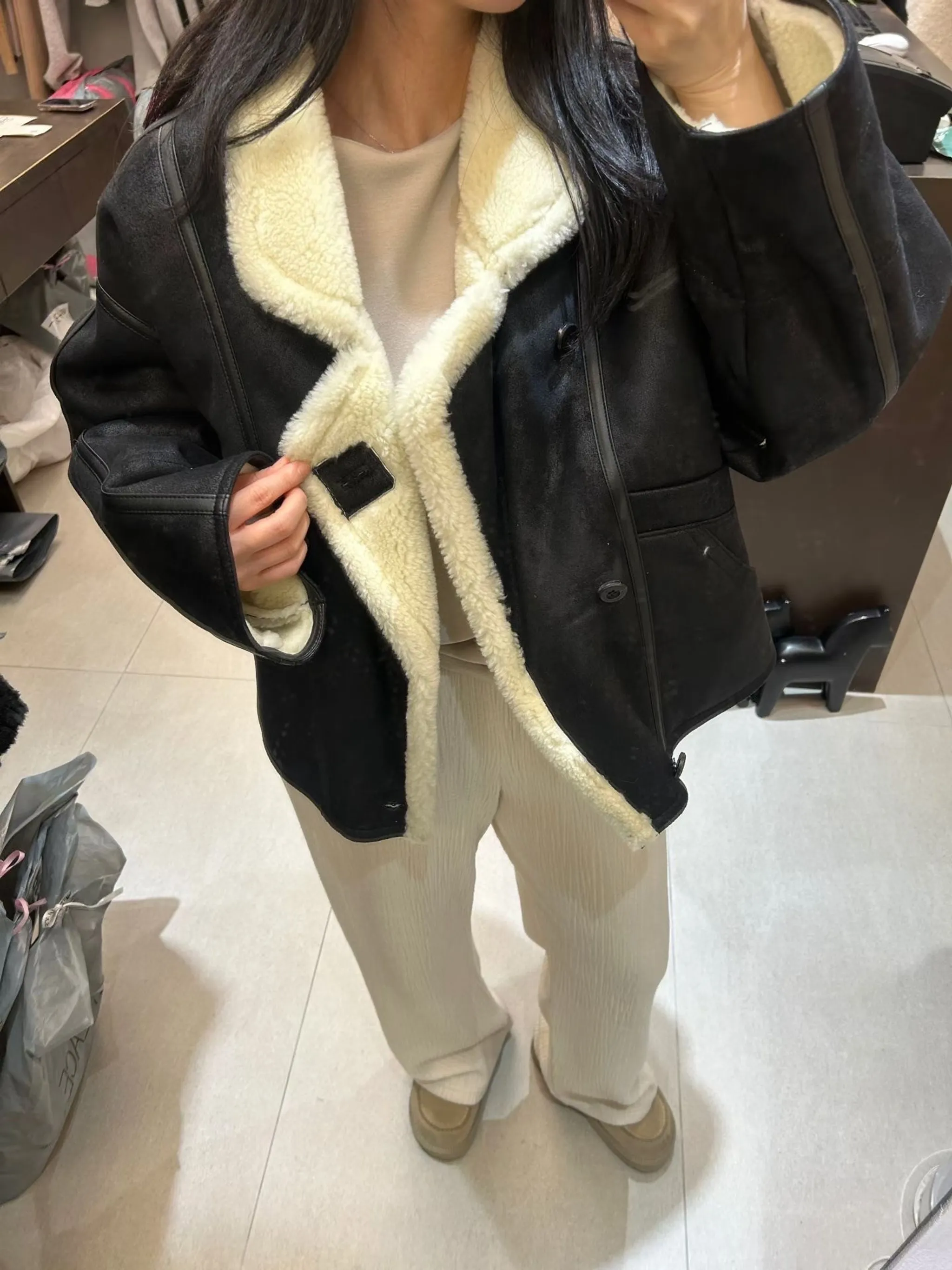 皮革包邊設計羊羔毛外