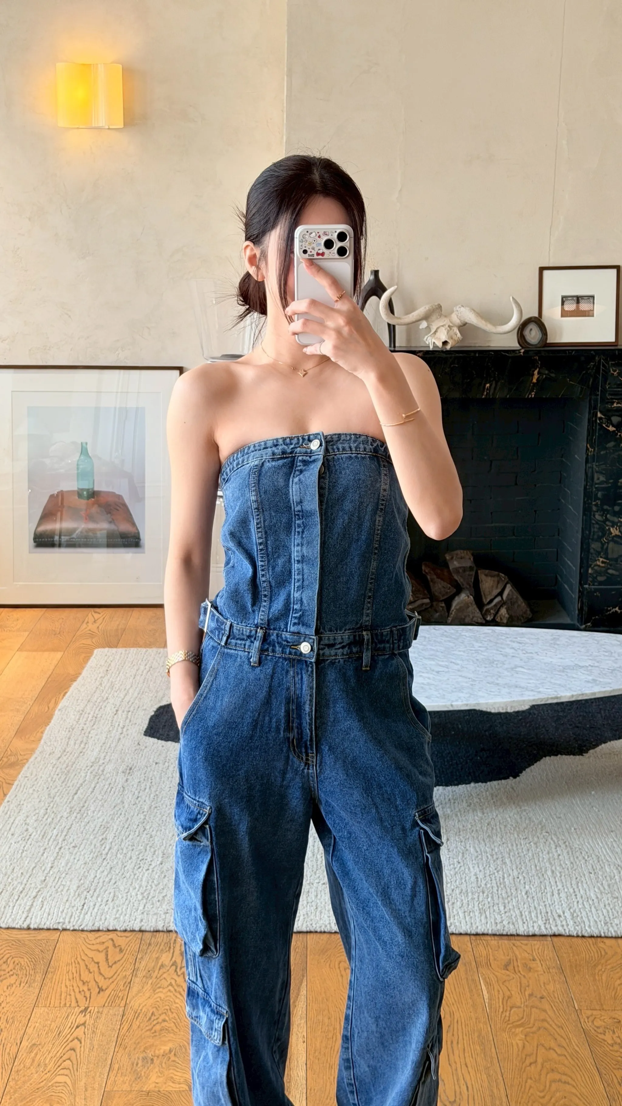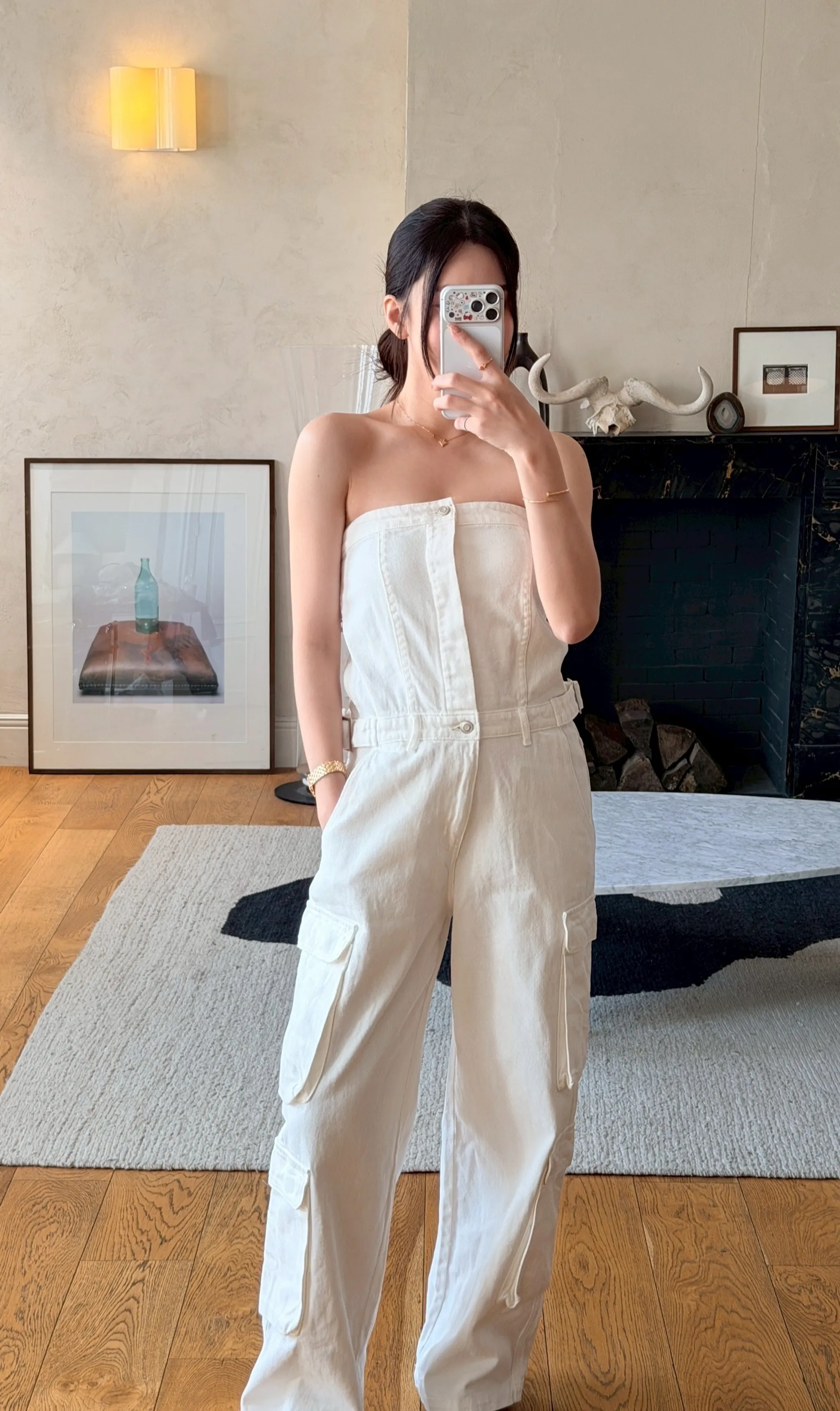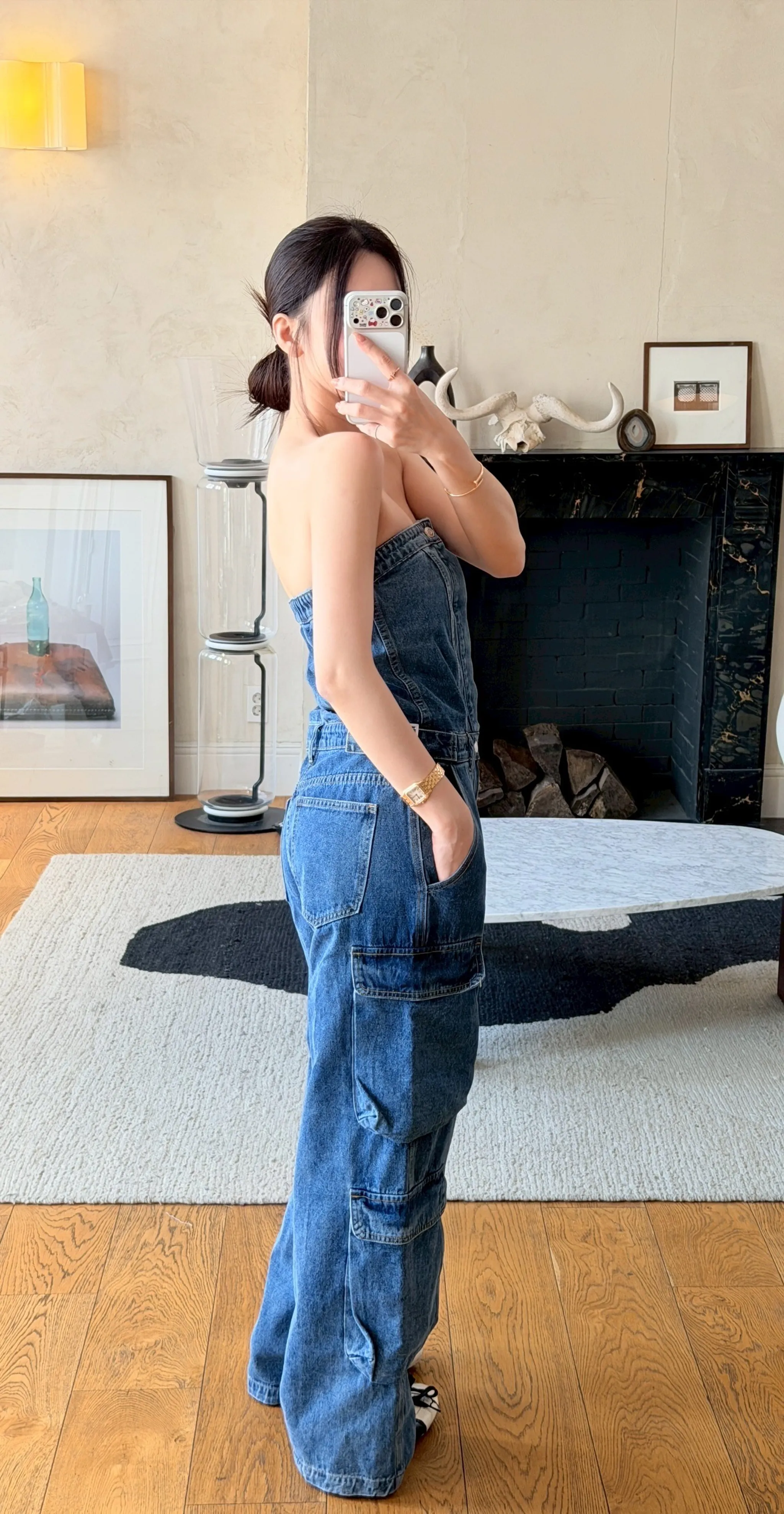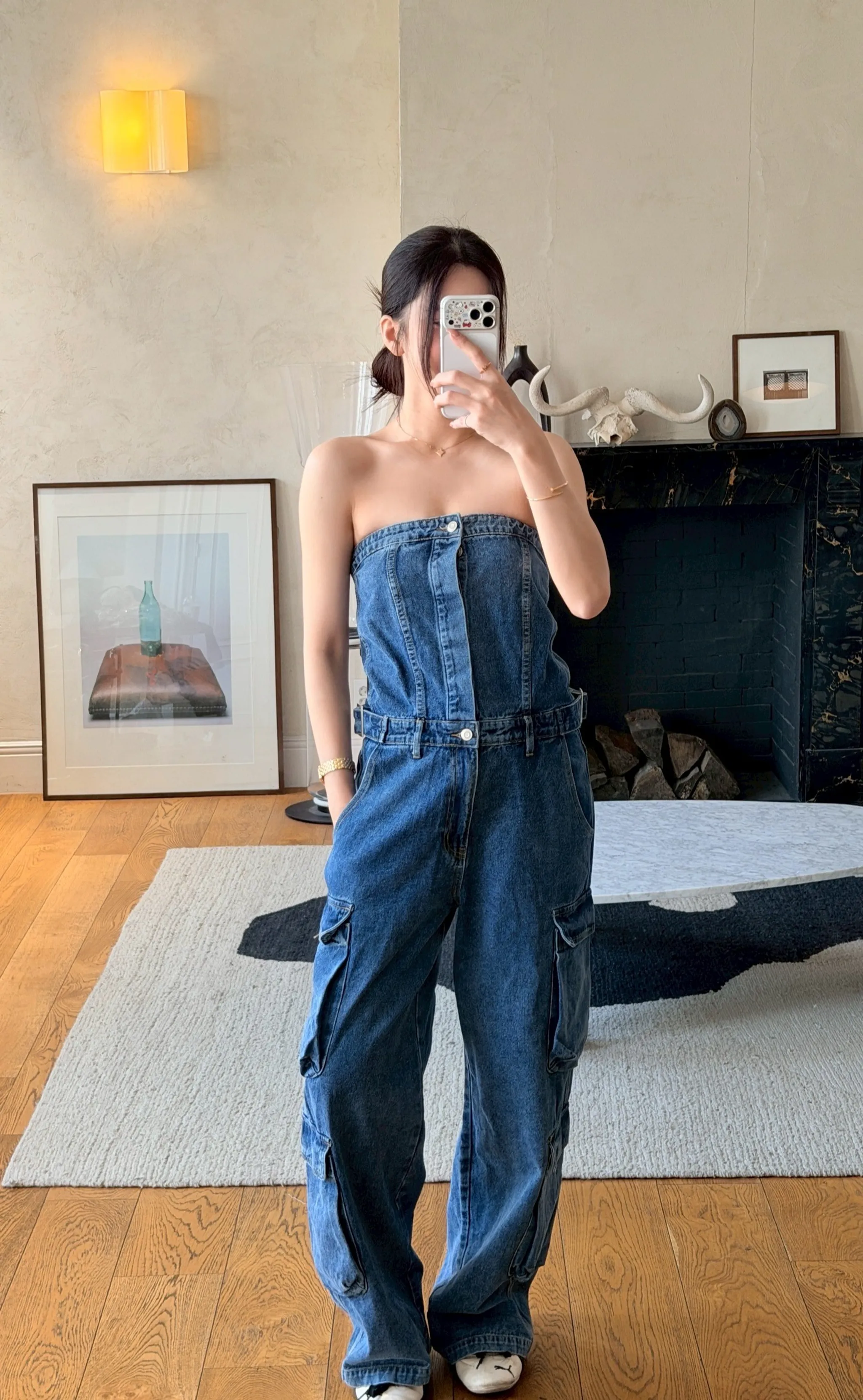 甜酷天花板|平口美式工裝丹寧連身褲:多口袋率性剪裁 (藍/白)