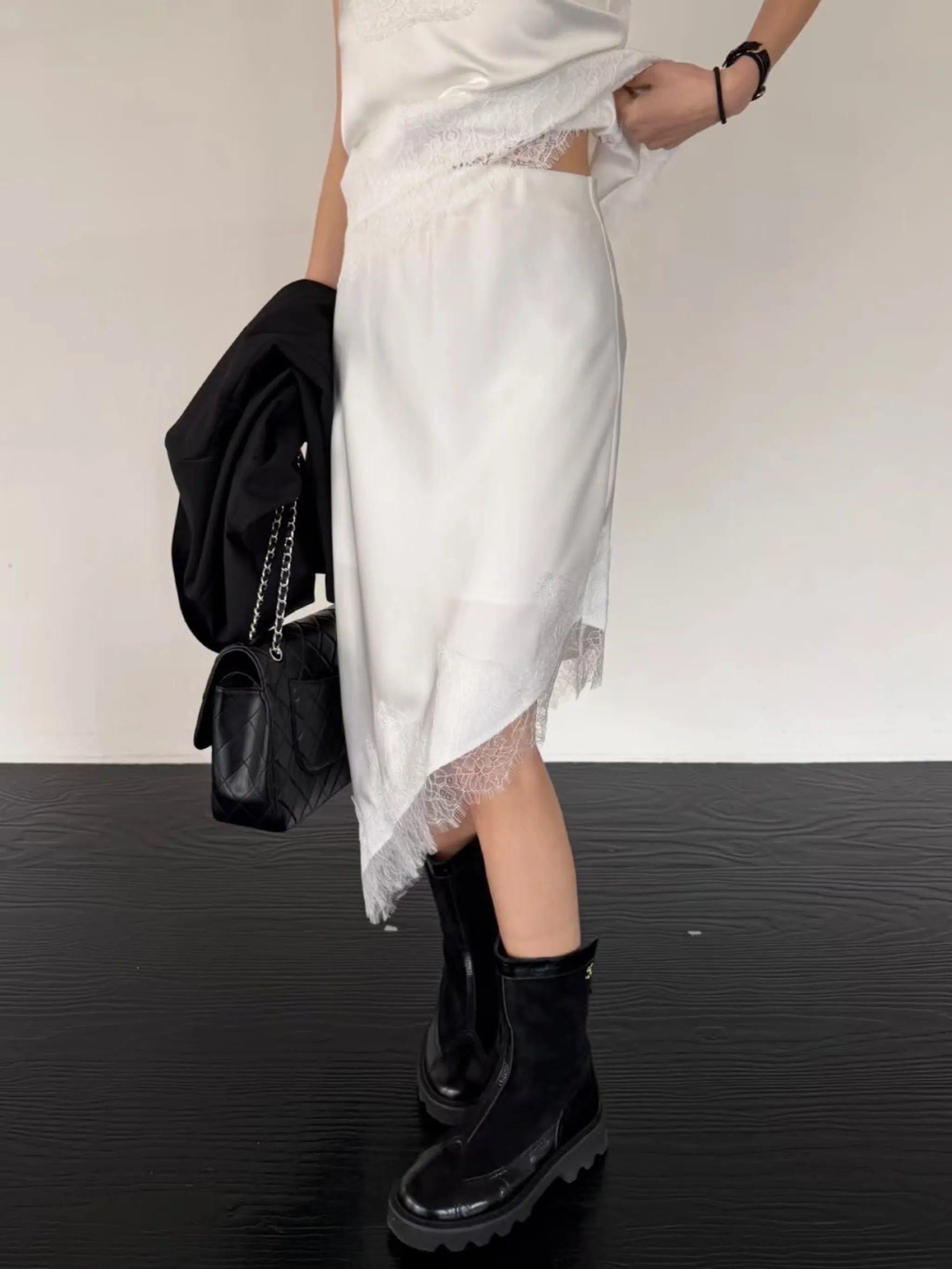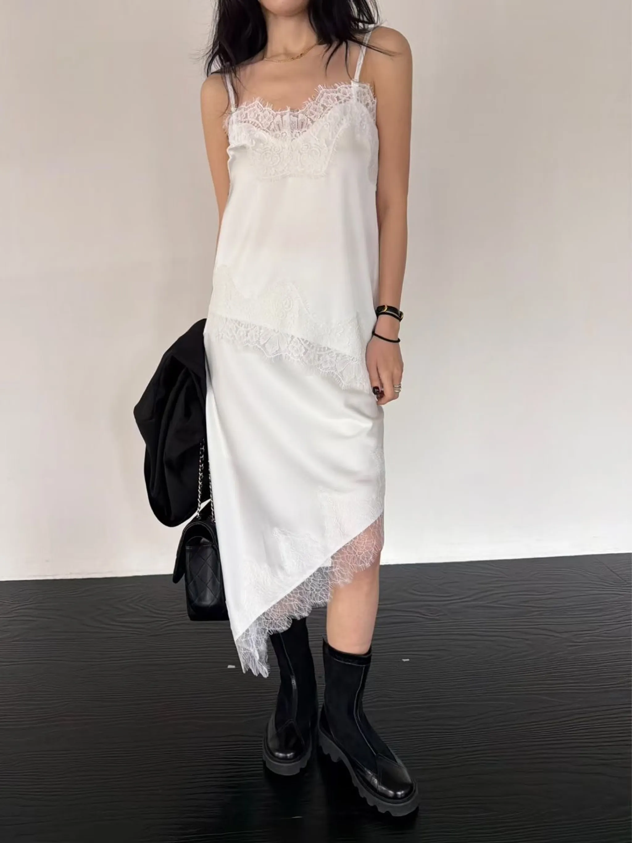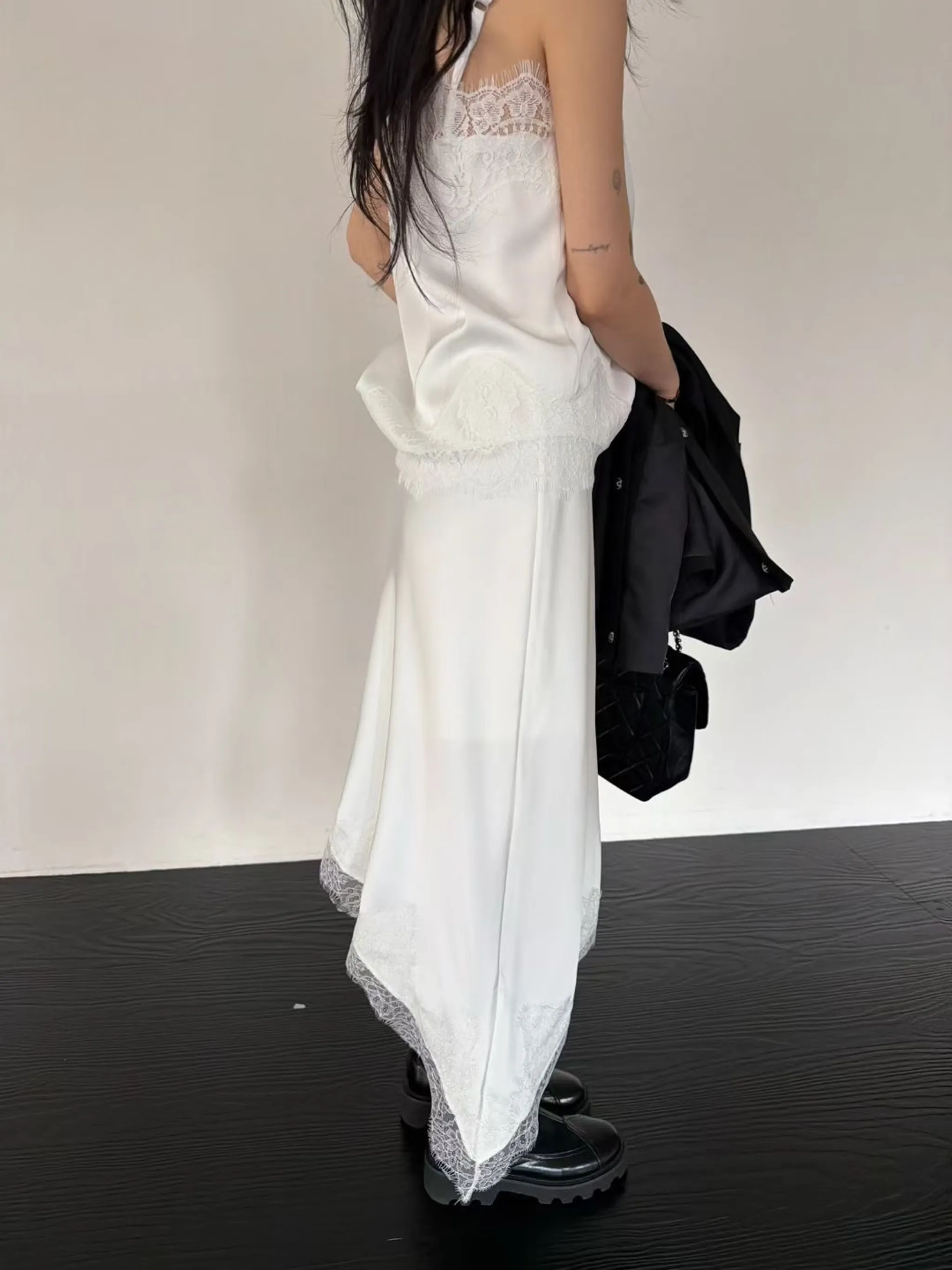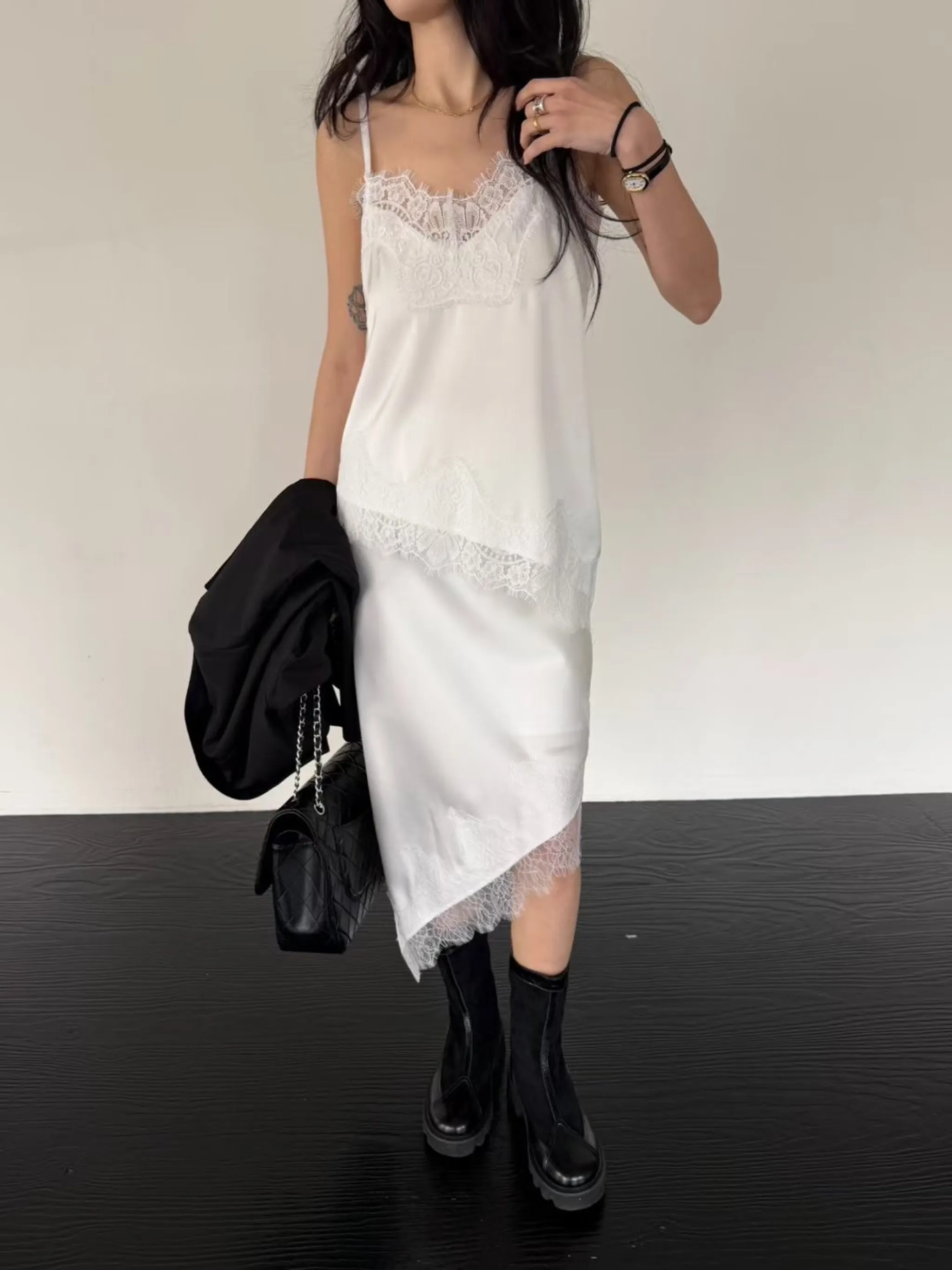 慵懶午后/睫毛蕾絲拼接絲緞兩件式長裙套裝