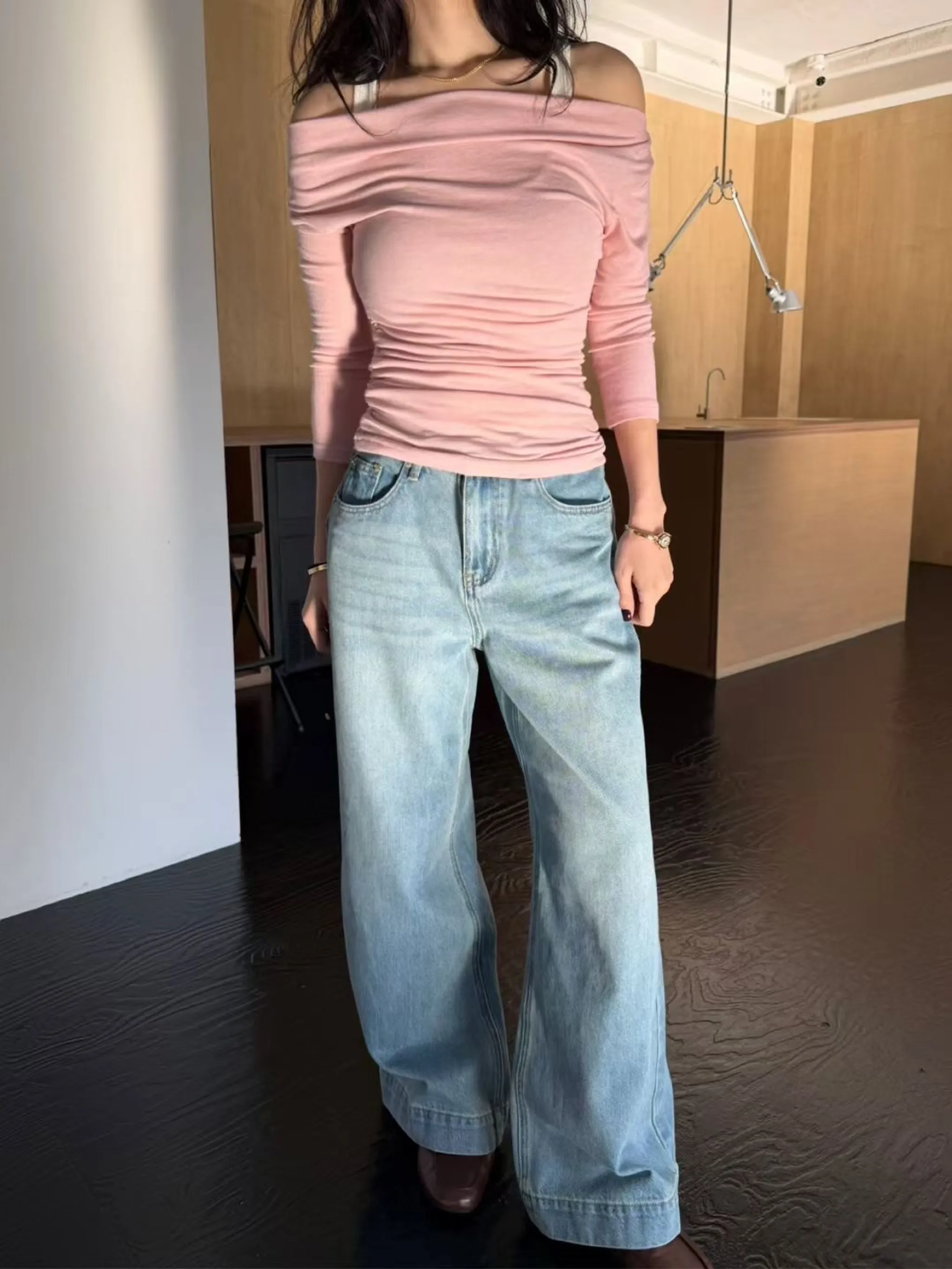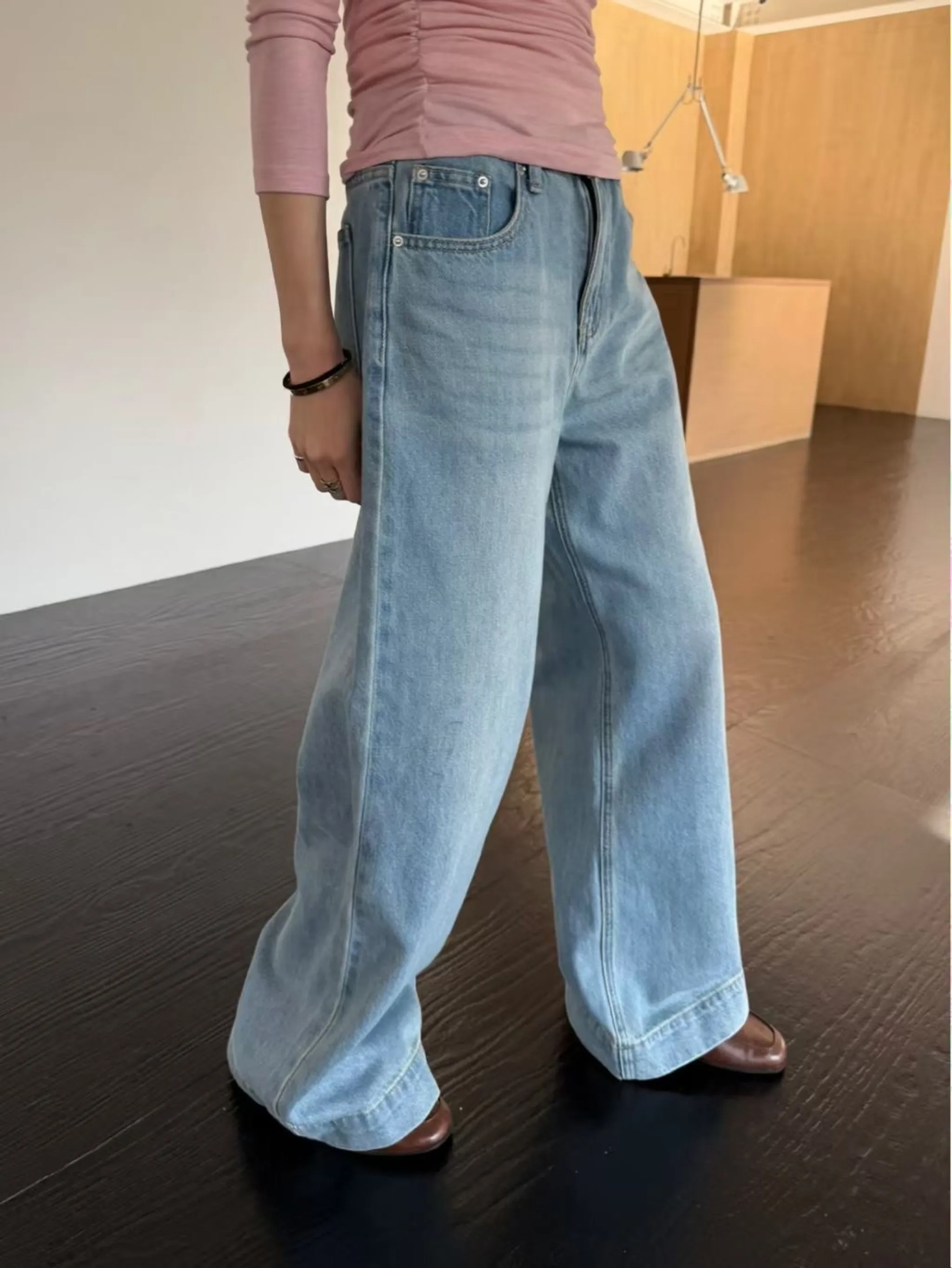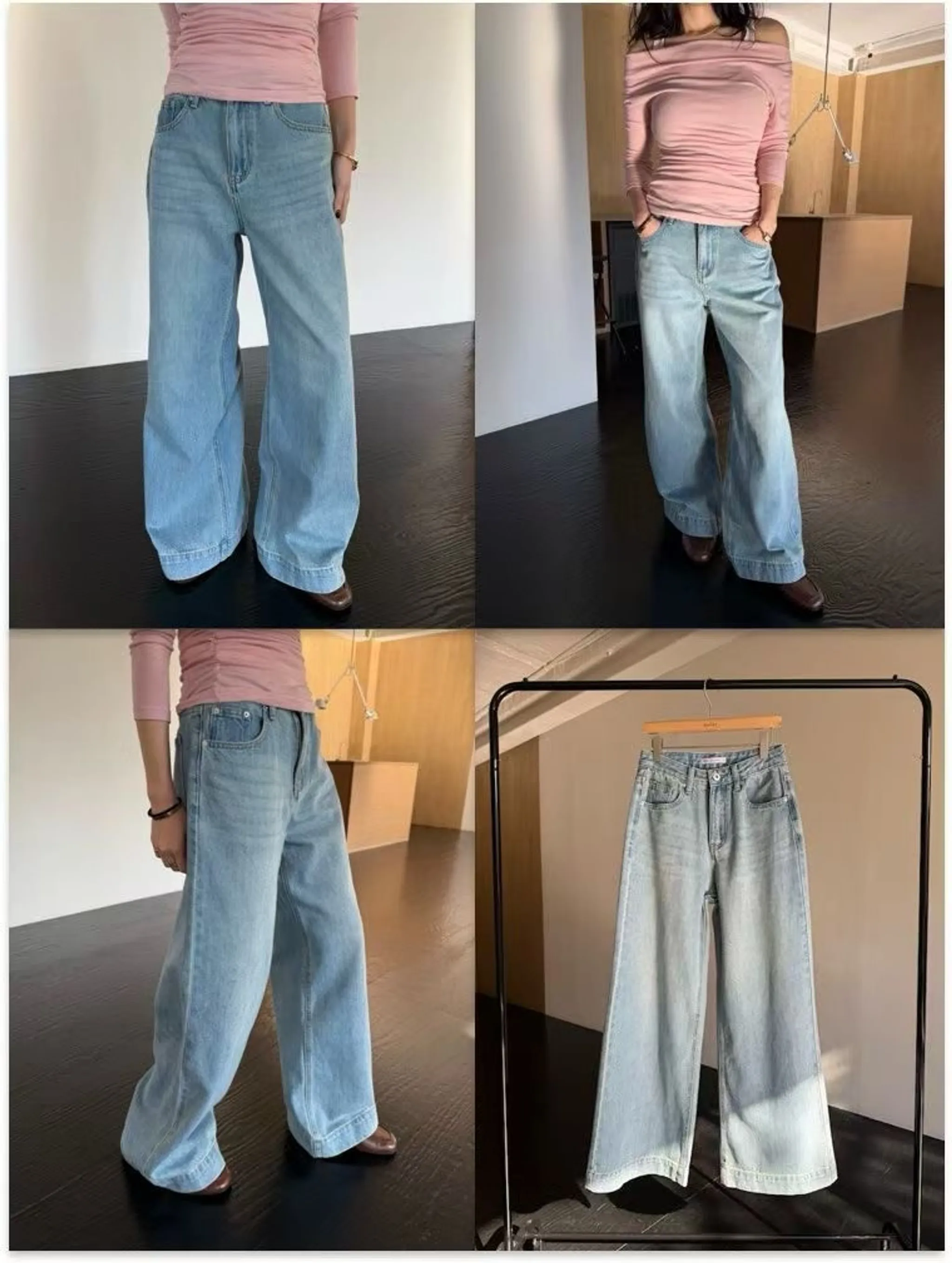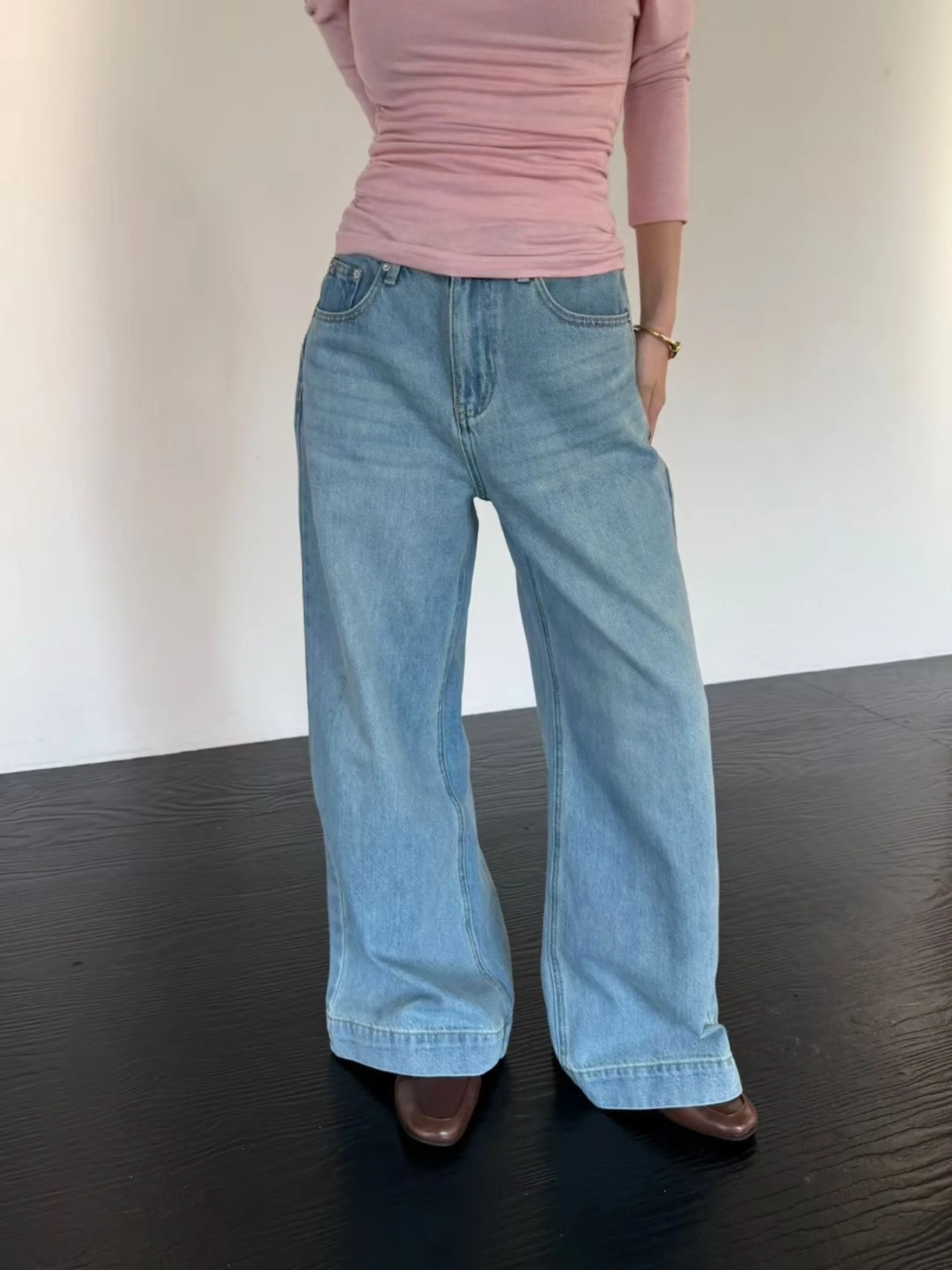 水洗刷色闊腿牛仔長褲