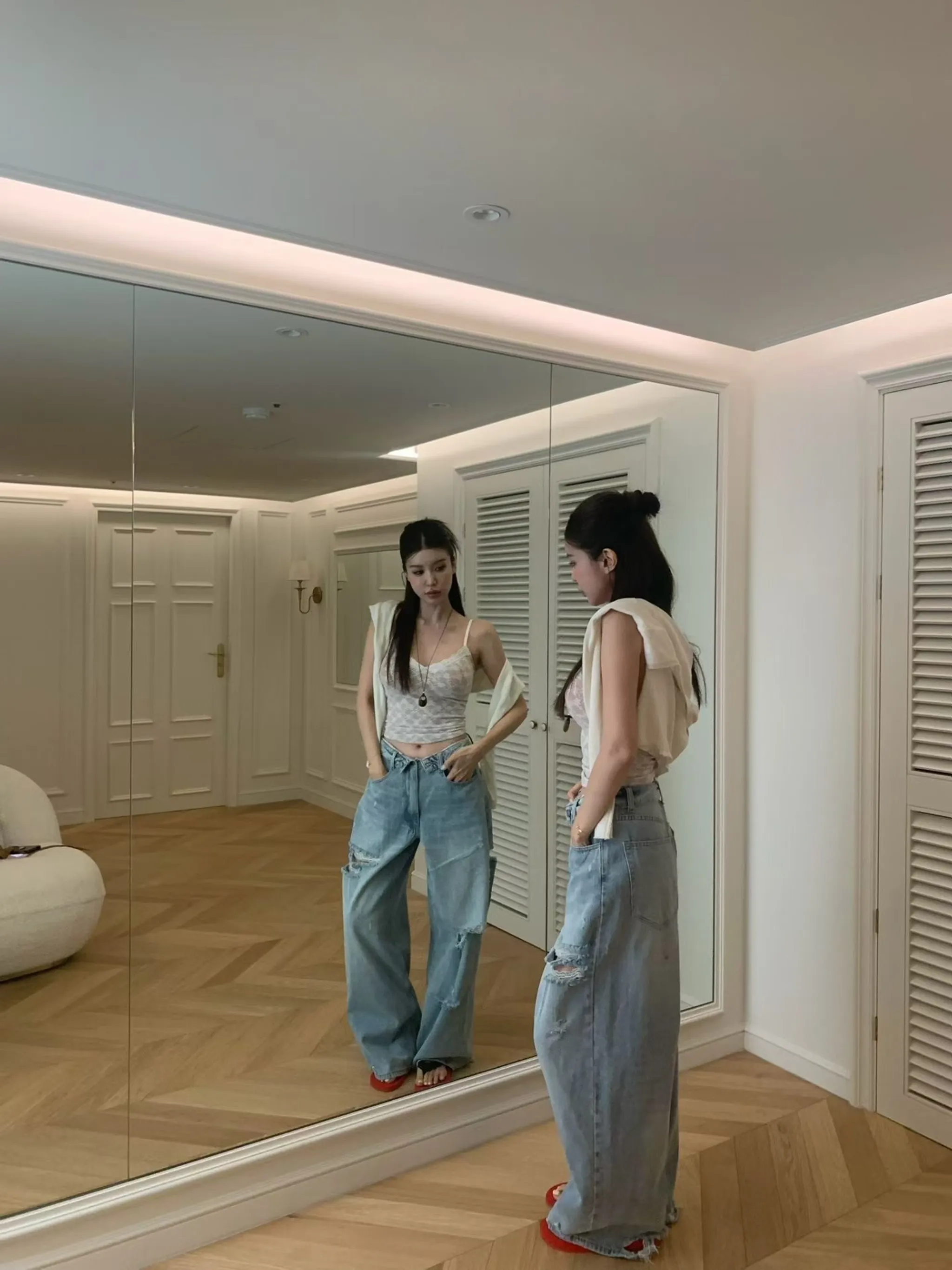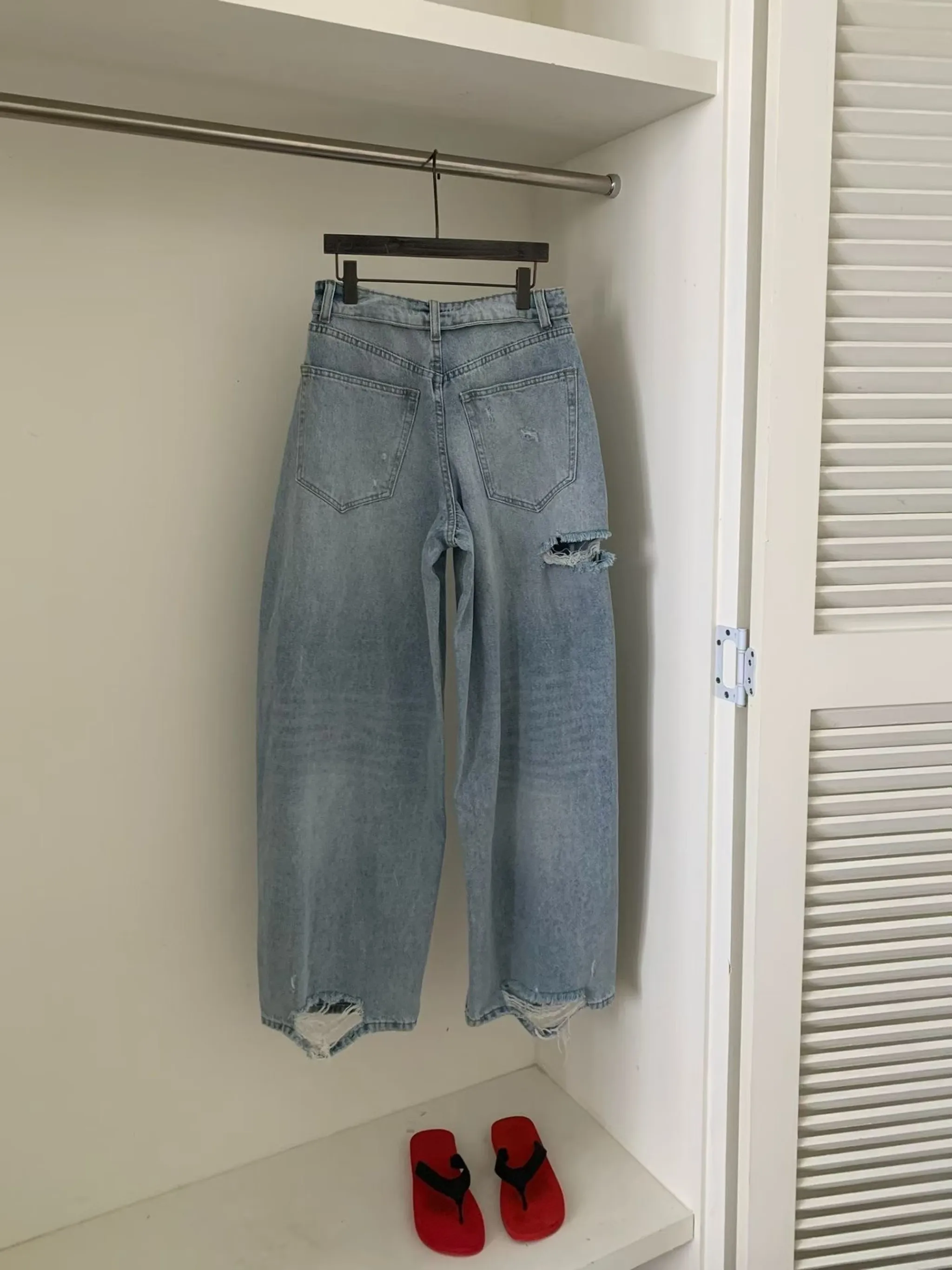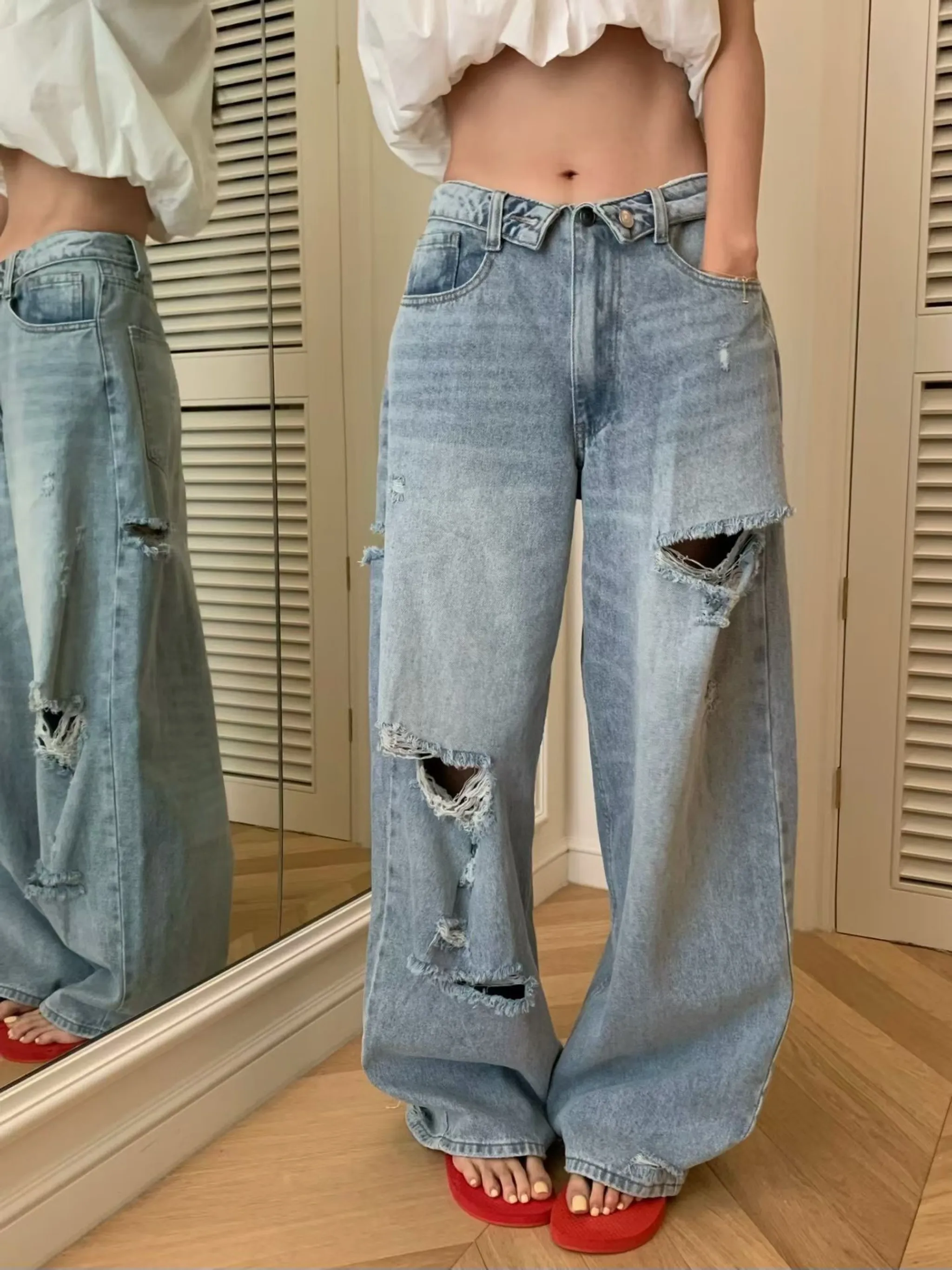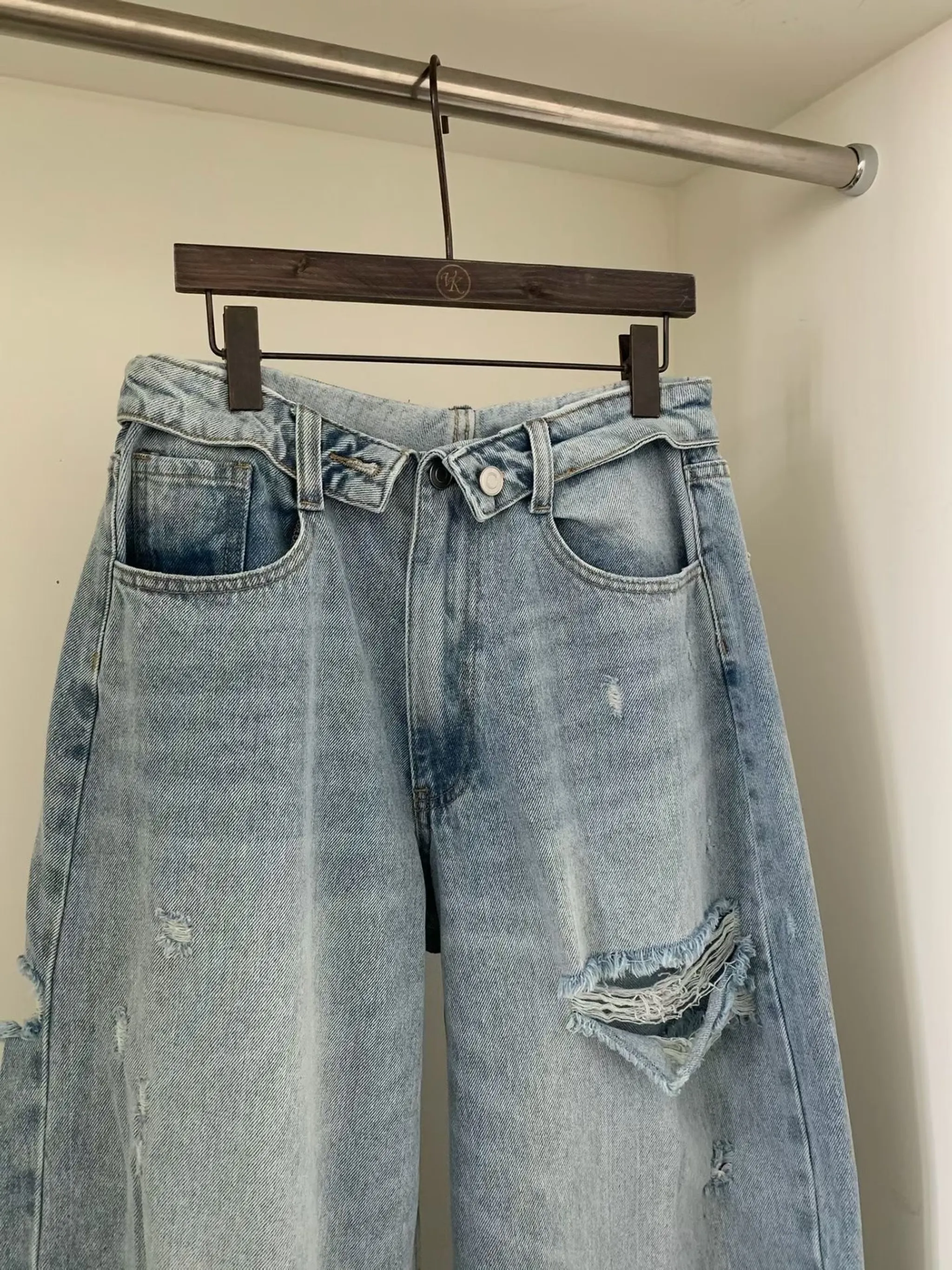 美式復古設計感褲頭刷破牛仔褲